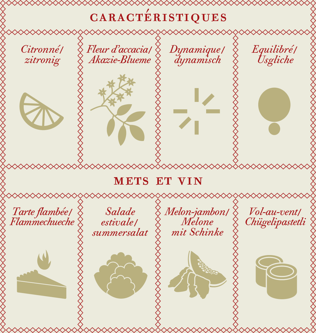 Dieser Wein ist so zu sagen die „geheim-Perle“ des Château und wird die Feinschmecker begeistern. Er besitzt viel Schwung, mit zarten Noten von weißen Blüten und Zitrusfrucht Schale. Dieser Pinot Blanc ist ein Genussöffner, er lässt sich mit einer Vielzahl von Gerichten kombinieren, Fisch, alle Sommerspeisen, Zürcher Geschnetzeltes, Flammkuchen, … E Guete!