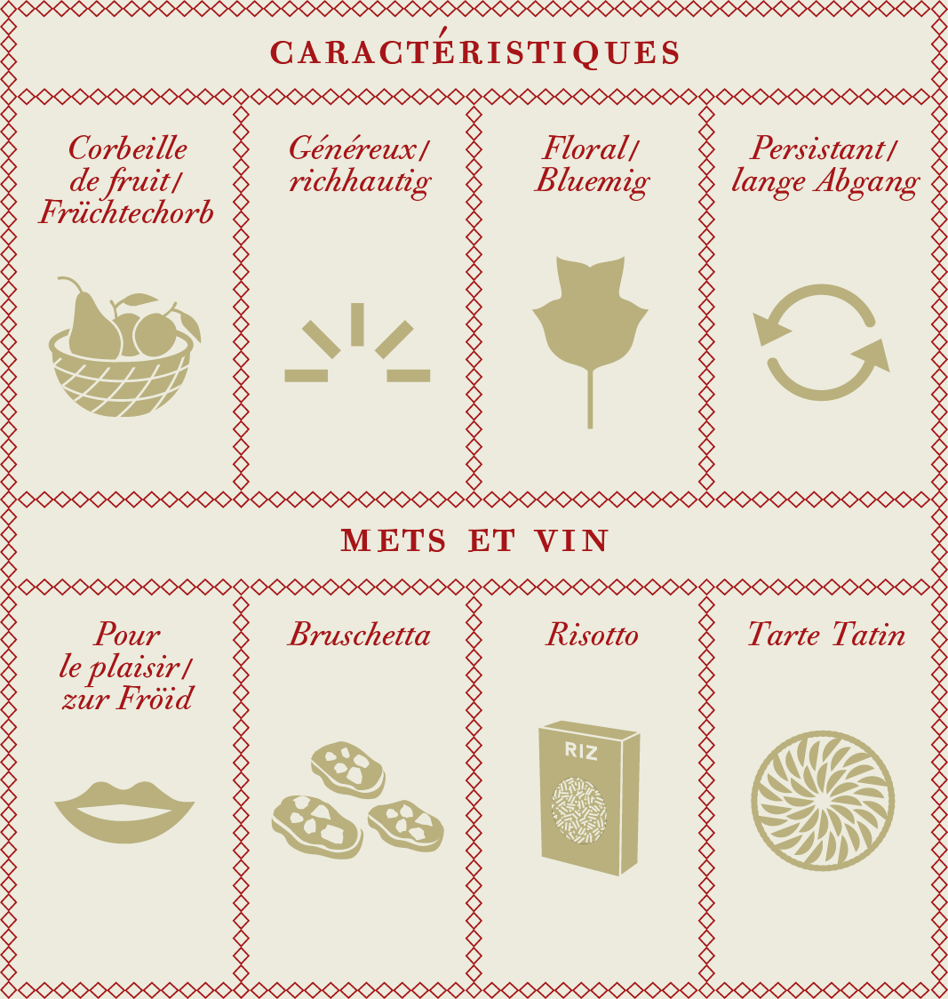 Plus subtile, la touche « Pinot Blanc » se distingue par une nuance de mélisse et l’intense vitalité au palais.